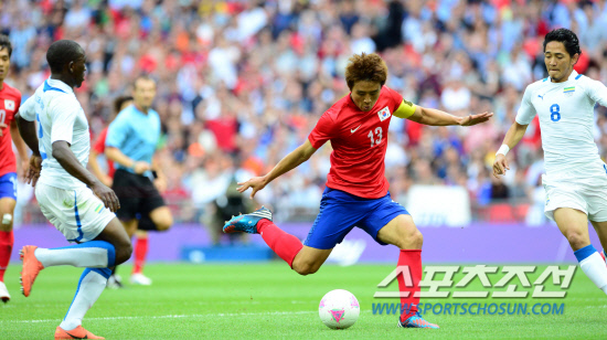 2012 런던올림픽 축구 대표팀의 구자철이 1일(현지시간) 런던 윔블리 스타디움에서 열린 조별 리그 3차 가봉전에서 슛을 시도하고 있다.