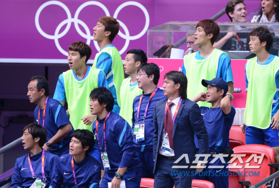 올림픽 축구대표팀 홍명보 감독과 선수들이 1일(현지시간) 영국 런던 웸블리 스타디움에서 열린 가봉과의 경기에서 슛이 빗나가자 아쉬워하고 있다.