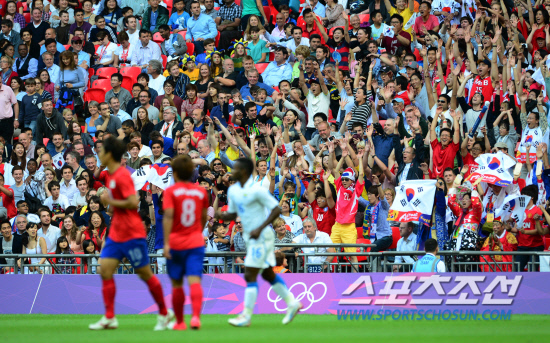 2012 런던올림픽 축구 대표팀이 1일(현지시간) 런던 윔블리 스타디움에서 열린 조별 리그 3차 가봉전을 치르는 가운데 한국 응원단이 현지인들과 뒤섞여 파도 응원을 펼치고 있다.