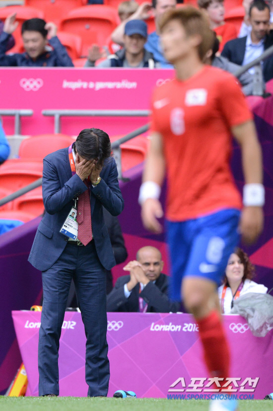 올림픽 축구대표팀 홍명보 감독이 1일(현지시간) 영국 런던 웸블리 스타디움에서 열린 가봉과의 경기에서 슛이 빗나가자 얼굴을 감싸고 있다.