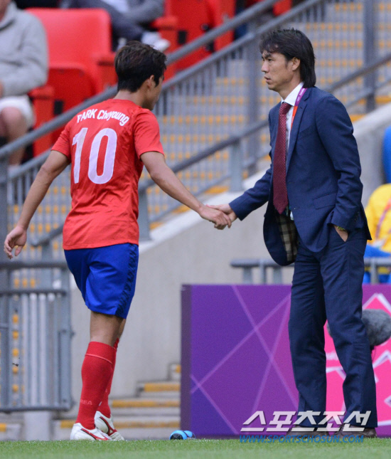 올림픽 축구대표팀 홍명보 감독이 1일(현지시간) 영국 런던 웸블리 스타디움에서 열린 가봉과의 경기에서 후반 교체된 박주영과 악수를 하고 있다.