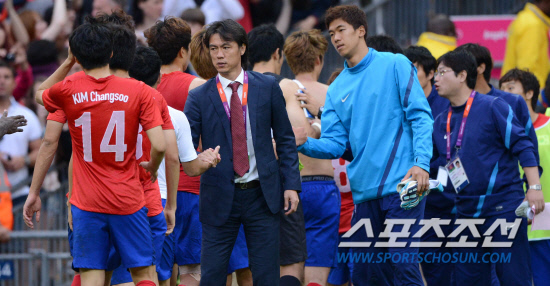 올림픽 축구대표팀 홍명보 감독이 1일(현지시간) 영국 런던 웸블리 스타디움에서 열린 가봉과의 경기에서 무승부를 기록하고 선수들과 악수를 나누고 있다.