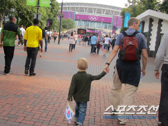 2일 새벽(한국시각) 런던 웸블리스타디움에서 펼쳐진 한국-가봉전을 보기 위해 영국 꼬마가 아빠 손을 꼭 잡고 스타디움을 향해 걸어가고 있다. 삐뚤삐뚤 직접 크레파스로 그린 태극기가 한눈에 들어왔다.