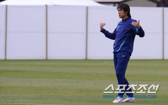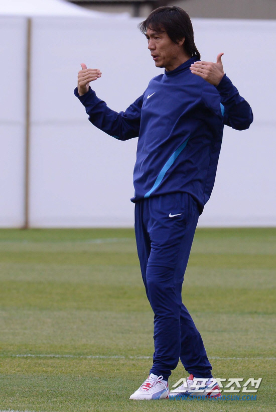 영국과의 8강전을 앞둔 홍명보 감독이 3일(현지시간) 영국 카디프대학 훈련장에서 선수들에게 단호한 표정으로 훈련을 독려하고 있다.