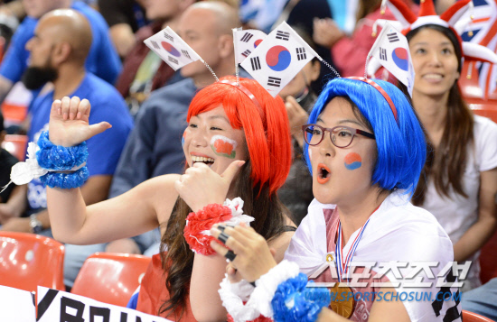 태극기를 머리에 꽂은 한국팬들이 4일(현지시간) 영국 카디프 밀레니엄 스타디움에서 열린 올림픽 축구대표팀과 영국의 경기에서 응원을 하고 있다.