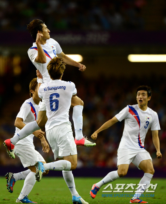 홍명보호가 4일 영국 카디프 밀레니엄스타디움에서 영국 단일팀과 8강전에서 격돌했다. 지동원이 전반 선취골을 성공시키고 동료들과 함께 환호하고 있다.