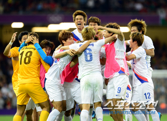 2012 런던 올림픽 축구대표팀의 구자철과 박주영 등 선수들이 4일(현지시간) 영국 카디프의 카디프 밀레니엄 스타디움에서 열린 영국 단일팀과의 8강전에서 승부차기 끝에 승리하자 환호하고 있다.