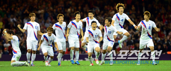 2012 런던 올림픽 축구대표팀의 구자철과 박주영, 기성용 등 선수들이 4일(현지시간) 영국 카디프의 카디프 밀레니엄 스타디움에서 열린 영국 단일팀과의 8강전에서 승부차기 키커로 나선 스터리지의 슛을 이범용 골키퍼가 선방하자 일제히 환호하고 있다.