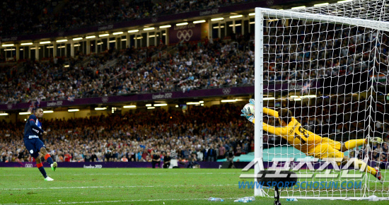 홍명보호가 4일 영국 카디프 밀레니엄스타디움에서 영국 단일팀과 8강전에서 격돌했다. 연장전까지 1대1 무승부 후 승부차기에서 골키퍼 이범영과 모든 키커들의 고른 활약으로 대한민국이 영국 단일팀에 5-4로 승리를 거뒀다. 영국의 5번째 키커 스투리지 다니엘(왼쪽)의 슈팅을 막아내고 있는 이범영.