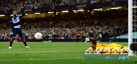 홍명보호가 4일 영국 카디프 밀레니엄스타디움에서 영국 단일팀과 8강전에서 격돌했다. 연장전까지 1대1 무승부 후 승부차기에서 골키퍼 이범영과 모든 키커들의 고른 활약으로 대한민국이 영국 단일팀에 5-4로 승리를 거뒀다. 영국의 5번째 키커 스투리지 다니엘의 슈팅을 막아내고 있는 이범영.