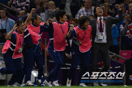 올림픽 축구대표팀 홍명보 감독과 코치들이 4일(현지시간) 영국 카디프 밀레니엄 스타디움에서 열린 영국과의 경기에서 승부차기 5-4로 극적인 승리를 한후 환호하고 있다.