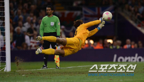 올림픽 축구대표팀 이범영이 4일(현지시간) 영국 카디프 밀레니엄 스타디움에서 열린 영국과의 경기 승부차기에서 영국 5번째 키커 스터리지의 볼을 막아내고 있다.