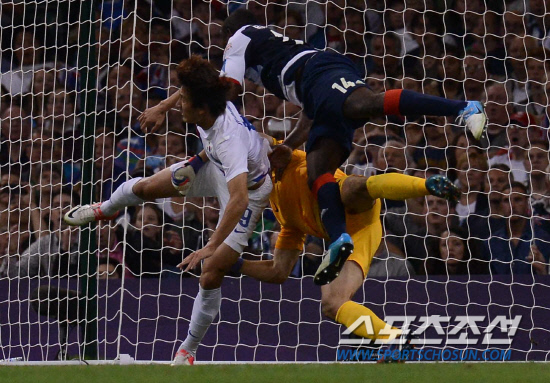 올림픽 축구대표팀 정성룡이 4일(현지시간) 영국 카디프 밀레니엄 스타디움에서 열린 영국과의 경기에서 플레이도중 부상을 당하고 있다.