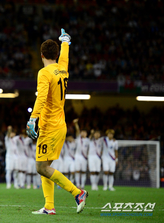 홍명보호가 4일 영국 카디프 밀레니엄스타디움에서 영국 단일팀과 8강전에서 격돌했다. 연장전까지 1대1 무승부 후 승부차기에서 골키퍼 이범영과 모든 키커들의 고른 활약으로 대한민국이 영국 단일팀에 5-4로 승리를 거뒀다. 영국의 5번째 키커 스투리지 다니엘의 슈팅을 막아내고 동료들을 가리키며 환호하고 있는 이범영.