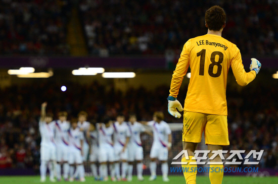 홍명보호가 4일 영국 카디프 밀레니엄스타디움에서 영국 단일팀과 8강전에서 격돌했다. 연장전까지 1대1 무승부 후 승부차기에서 골키퍼 이범영과 모든 키커들의 고른 활약으로 대한민국이 영국 단일팀에 5-4로 승리를 거뒀다. 영국의 5번째 키커 스투리지 다니엘의 슈팅을 막아내고 동료들을 가리키며 환호하고 있는 이범영.