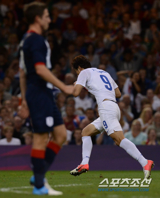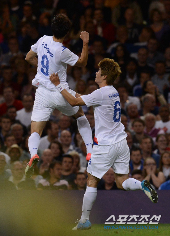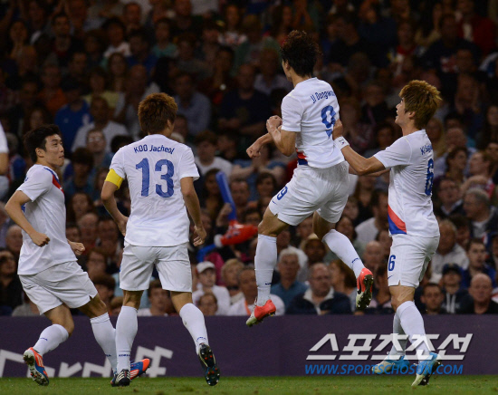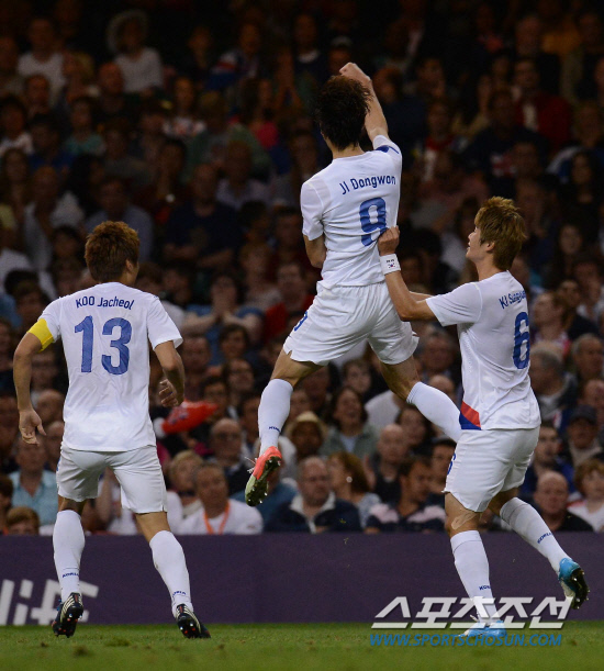 올림픽 축구대표팀 지동원이 4일(현지시간) 영국 카디프 밀레니엄 스타디움에서 열린 영국과의 경기에서 골을 성공시키고 동료들과 기쁨을 나누고 있다.
