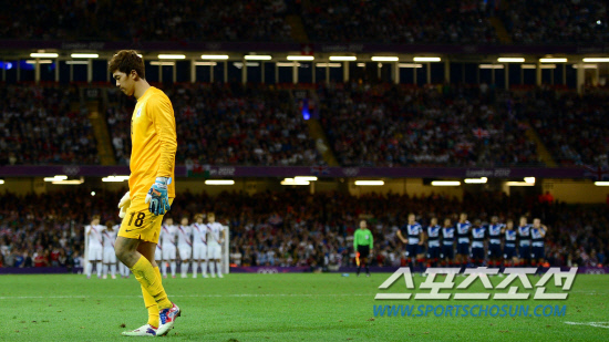 '홍명보호가 영국을 잡고 4강에 진출 했다.' 영국 카디프 밀레니엄스타디움에서 열린 영국 단일팀과 8강전에서 대표팀은 전후반 연장까지 1대1 무승무를 기록하며 승부차기로 승자를 가렸다. 승부차기에서 대표팀은 이범영 골키퍼의 선방과 키커로 나선 5명의 선수들이 모두 득점에 성공하며 영국에 5-4로 승리했다. 진지한 표정으로 승부차기에 임하고 있는 이범영 골키퍼(왼쪽).