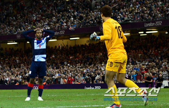 '홍명보호가 영국을 잡고 4강에 진출 했다.' 영국 카디프 밀레니엄스타디움에서 열린 영국 단일팀과 8강전에서 대표팀은 전후반 연장까지 1대1 무승무를 기록하며 승부차기로 승자를 가렸다. 승부차기에서 대표팀은 이범영 골키퍼의 선방과 키커로 나선 5명의 선수들이 모두 득점에 성공하며 영국에 5-4로 승리했다. 영국의 5번째 키커 스터리지의 골을 막아낸 이범영 골키퍼(오른쪽)가 환호하고 있다.