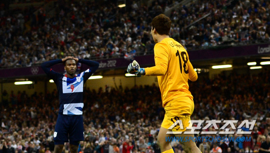 '홍명보호가 영국을 잡고 4강에 진출 했다.' 영국 카디프 밀레니엄스타디움에서 열린 영국 단일팀과 8강전에서 대표팀은 전후반 연장까지 1대1 무승무를 기록하며 승부차기로 승자를 가렸다. 승부차기에서 대표팀은 이범영 골키퍼의 선방과 키커로 나선 5명의 선수들이 모두 득점에 성공하며 영국에 5-4로 승리했다. 영국의 5번째 키커 스터리지의 골을 막아낸 이범영 골키퍼(오른쪽)가 환호하고 있다.