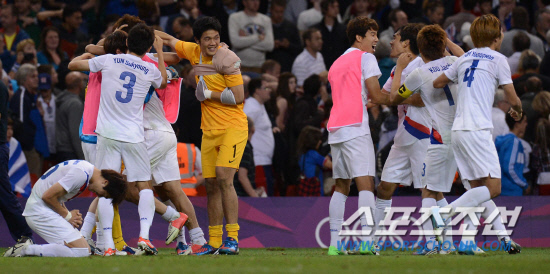 올림픽 축구대표팀 선수들이 4일(현지시간) 영국 카디프 밀레니엄 스타디움에서 열린 영국과의 경기에서 승부차기 5-4로 극적인 승리를 한후 기쁨을 나누고 있다.