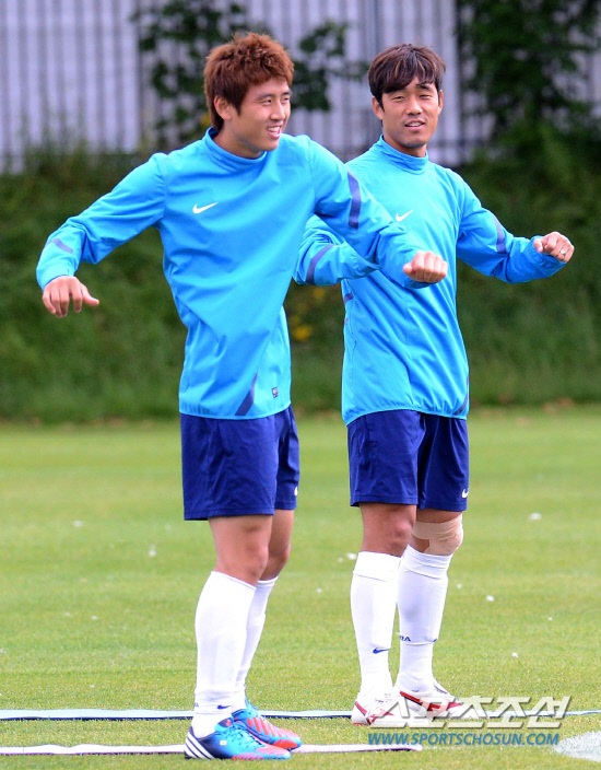 올림픽 축구대표팀 구자철, 박주영이 6일(현지시간) 영국 맨체스터 Grammar School에서 열린 훈련에서 몸을 풀고 있다.