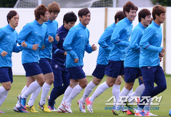 올림픽 축구대표팀 구자철, 기성용, 박주영, 지동원 등 선수들이 6일(현지시간) 영국 맨체스터 Grammar School에서 열린 훈련에서 가벼운 달리기로 몸을 풀고 있다.
