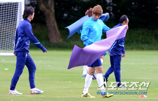 올림픽 축구대표팀 기성용이 6일(현지시간) 영국 맨체스터 Grammar School에서 열린 훈련에서 매트를 깔고 있다.