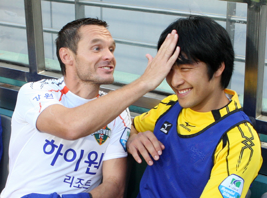 ◇데니스(왼쪽)가 4일 서울월드컵경기장에서 열린 FC서울과의 2012년 K-리그 경기에 앞서 벤치에서 골키퍼 송유걸과 장난을 치고 있다. 사진제공=강원FC