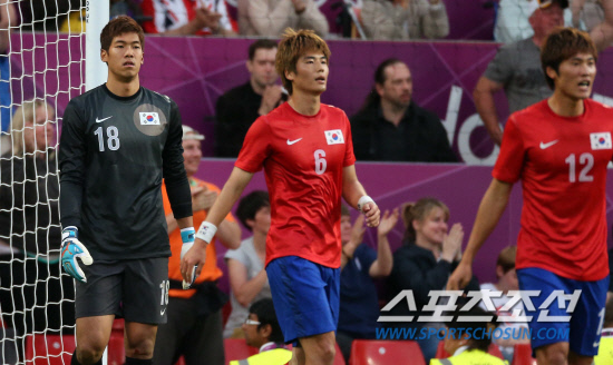 올림픽 축구대표팀 이범영과 기성용이 7일(현지시간) 영국 맨체스터 올드 트래퍼드 스타디움에서 열린 브라질과의 4강전 경기에서 전반 실점을 하고 아쉬워하고 있다.