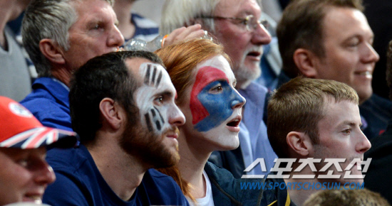 2012 런던올림픽 축구대표팀이 7일(현지시간) 영국 맨체스터시 올드 트래포드 스타디움에서 열린 남자 축구 준결승 브라질전을 치르는 가운데 세번째 골을 헌납하며 패색이 짙어지자 태극기 문양의 페이스 페인팅을 한 외국인 커플이 아쉬움을 삼키고 있다.