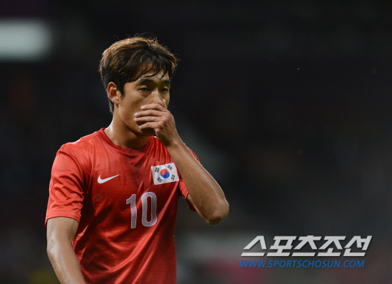 2012 런던올림픽 축구대표팀의 박주영이 7일(현지시간) 영국 맨체스터시 올드 트래포드 스타디움에서 열린 남자 축구 준결승 브라질전에서 후반 교체 투입된 뒤 패스가 연결되지 않자 아쉬움을 삼키고 있다.