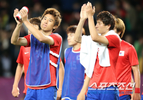 올림픽 축구대표팀 구자철과 지동원이 7일(현지시간) 영국 맨체스터 올드 트래퍼드 스타디움에서 열린 브라질과의 4강전 경기에서 3-0으로 패한 후 아쉬운 표정으로 팬들에게 인사를 하고 있다.
