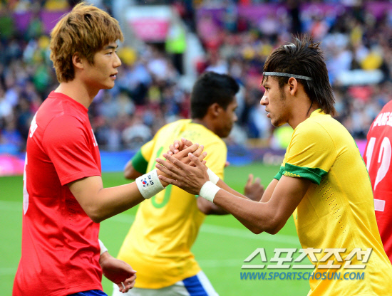 결승 진출에 도전하는 홍명보호가 7일 맨체스터 올드트라포드경기장에서 브라질과 대결을 펼쳤다. 경기 전 브라질 네이마르가 기성용과 악수를 나누고 있다.