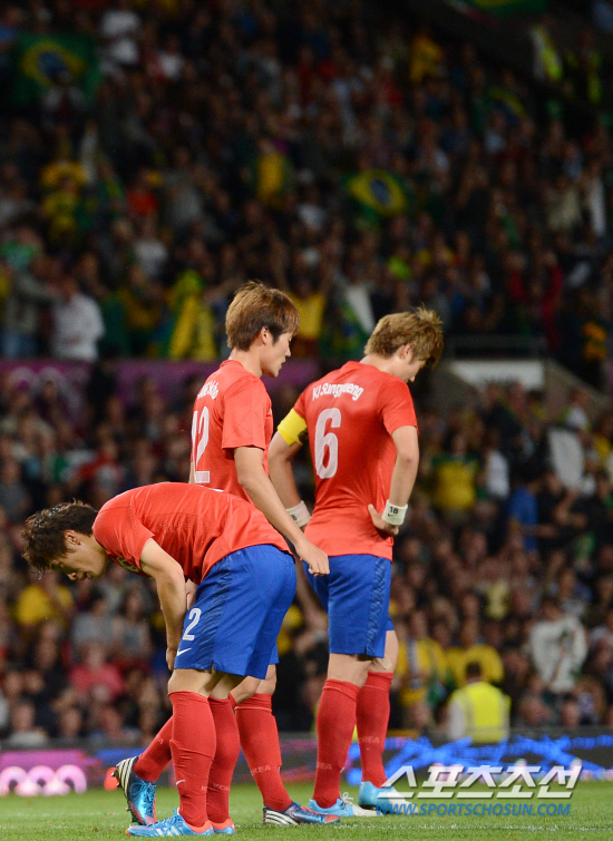7일 저녁(현지시간) 영국 맨체스터 올드 트래퍼드 스타디움에서 열린 브라질과의 4강전에서 한국 대표팀이 세번째 골을 내주고 망연자실해 있다.