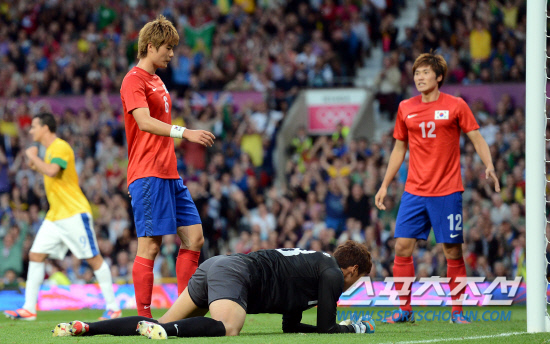 7일 저녁(현지시간) 영국 맨체스터 올드 트래퍼드 스타디움에서 열린 브라질과의 4강전에서 한국 대표팀이 첫번째 골을 내주고 망연자실해 있다.20120807맨체스터=올림픽사진공동취재단L