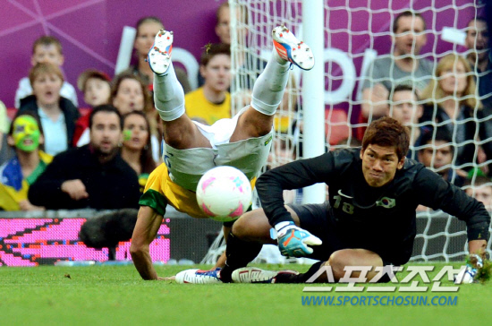 2012 런던올림픽 축구대표팀의 이범영 골키퍼가 7일(현지시간) 영국 맨체스터시 올드 트래포드 스타디움에서 열린 남자 축구 준결승전에서 상대 공격수의 슛찬스를 차단하고 있다. '축구종가' 영국을 넘어 올림픽 사상 첫 4강 진출의 위업을 달성한 축구대표팀이 박지성의 땀이 배어있는 올드트래포트 구장에서 '카디프의 기적'을 재현할 수 있을 지 기대를 모은다. 20120807 맨체스터=올림픽사진공동취재단j |