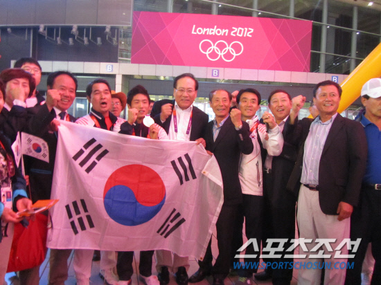 ◇양학선의 대한민국 사상 첫 금메달 직후 정동화 대한체조협회장 등 체조협회 관계자들이 태극기를 들고 "한국 체조 파이팅"을 외쳤다.