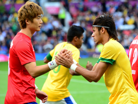 결승 진출에 도전하는 홍명보호가 7일 맨체스터 올드트라포드경기장에서 브라질과 대결을 펼쳤다. 경기 전 브라질 네이마르가 기성용과 악수를 나누고 있다. 맨체스터=올림픽사진공동취재단k