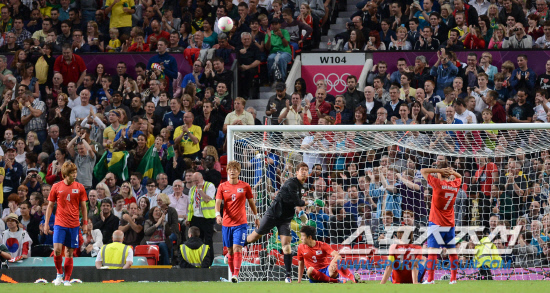 한국 올림픽대표팀이 일본과 동메달을 놓고 숙명의 맞대결을 펼친다. 지난 브라질전 경기 장면. 맨체스터=올림픽사진공동취재단