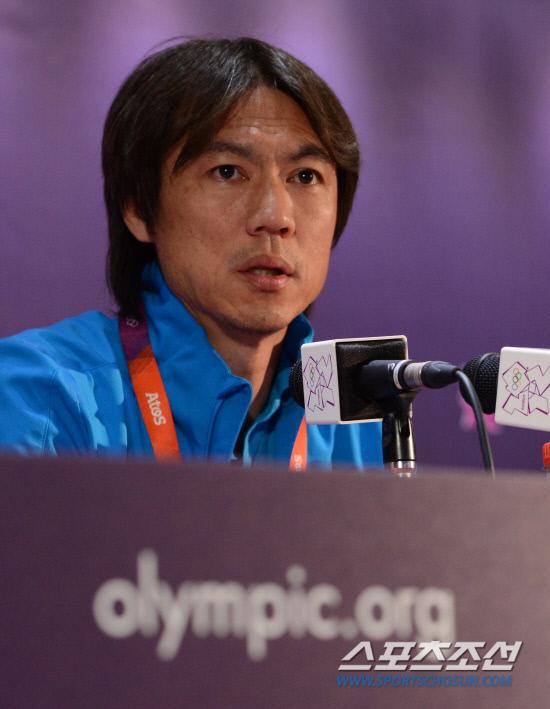 올림픽 축구대표팀 홍명보 감독이 9일(현지시간) 영국 카디프 밀레니엄 스타디움에서 열린 기자회견에서 기자들의 질문에 답하고 있다.