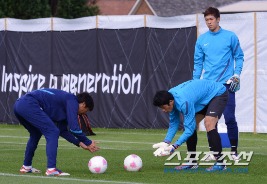올림픽 축구대표팀 정성룡과 이범영이 9일(현지시간) 영국 카디프대학 훈련장에서 훈련을 하고 있다.