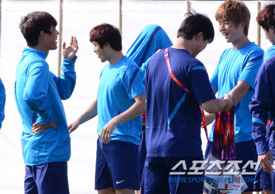 올림픽 축구대표팀 박주영과 기성용이 9일(현지시간) 영국 카디프대학 훈련장에서 밝은 표정으로 훈련을 하고 있다.