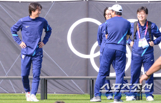 올림픽 축구대표팀 홍명보 감독이 9일(현지시간) 영국 카디프대학 훈련장에서 협회 관계자들과 활짝 웃으며 얘기하고 있다.