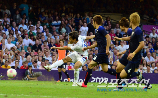사상 처음으로 올림픽 4강에 진출한 대한민국 축구대표팀이 10일(현지시간) 오후 영국 카디프의 밀레니엄 스타디움에서 동메달을 놓고 숙적 일본과 맞붙었다. 전반 37분경 박주영이 3명의 일본 수비수를 따돌리고 첫골을 터트리고 있다.120810.런던=올림픽공동사진기자단E
