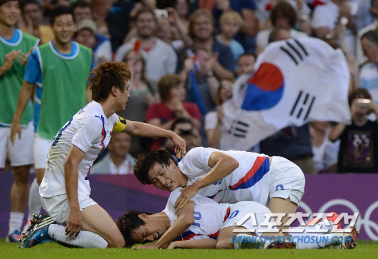 올림픽 축구대표팀 박주영이 10일(현지시간) 영국 카디프 밀레니엄 스타디움에서 열린 일본과의 경기에서 전반 골을 성공시키고 구자철, 지동원과 기쁨을 나누고 있다.
