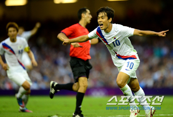 홍명보 감독이 이끄는 올림픽 축구대표팀이 10일 영국 카디프 밀레니엄스타디움에서 일본과 동메달 결정전을 펼쳤다. 박주영이 전반 37분 선취골을 성공시키고 환호하고 있다.