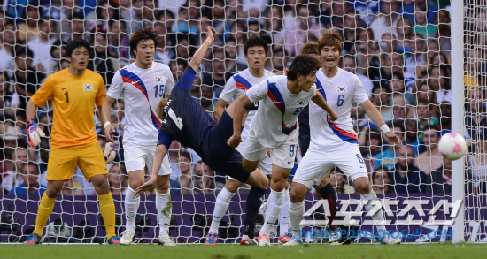 올림픽 축구대표팀 지동원이 10일(현지시간) 영국 카디프 밀레니엄 스타디움에서 열린 일본과의 경기에서 헤딩으로 볼을 걷어내고 있다.