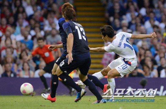 올림픽 축구대표팀 박주영이 10일(현지시간) 영국 카디프 밀레니엄 스타디움에서 열린 일본과의 경기에서 전반 강력한 오른발 슛을 성공시키고 있다.