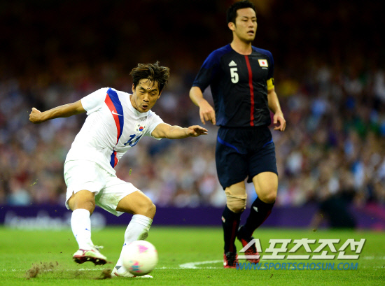 홍명보 감독이 이끄는 올림픽 축구대표팀이 10일 영국 카디프 밀레니엄스타디움에서 일본과 동메달 결정전을 펼쳤다. 박주영이 전반 37분 선취골을 성공시키고 있다. 일본 수비수를 제치며 힘차게 슈팅을 날리고 있는 박주영.