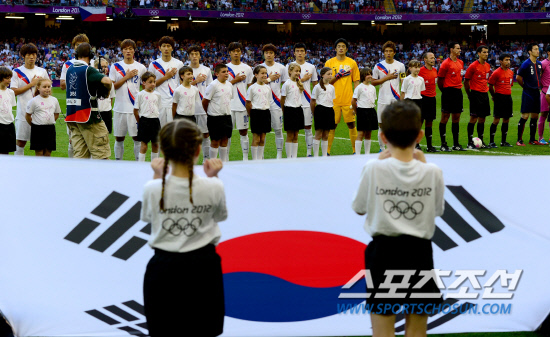 홍명보 감독이 이끄는 올림픽 축구대표팀이 10일 영국 카디프 밀레미엄스타디움에서 일본과 동메달 결정전을 펼쳤다. 경기 전 태극기를 바라보고 있는 선수들.